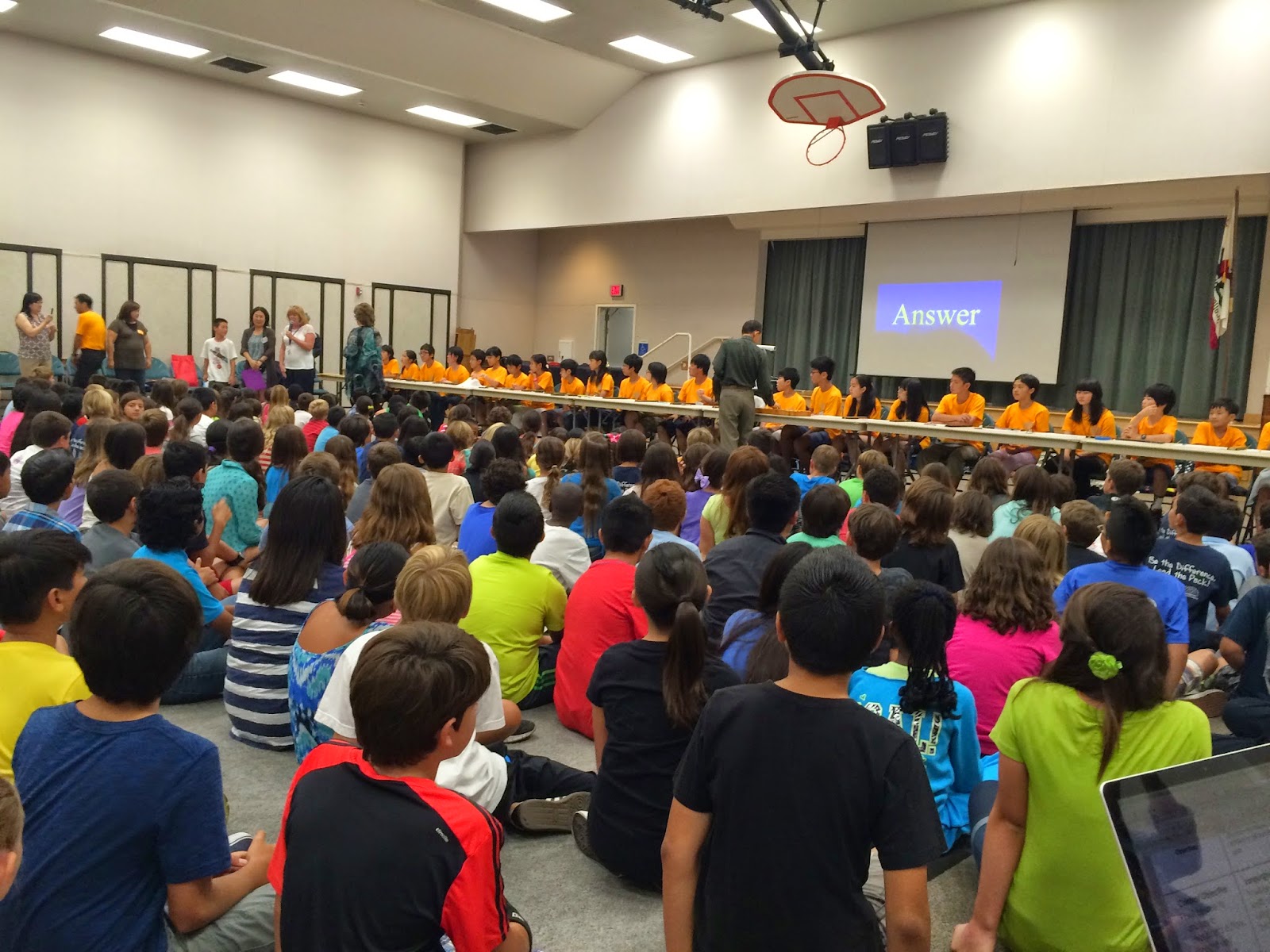 After the assembly, the 5th grade classrooms were able to work one-on-one with the Japanese students. Our 5th graders were divided between the four other 5th grade classrooms, and they learned basic abacus manipulations.